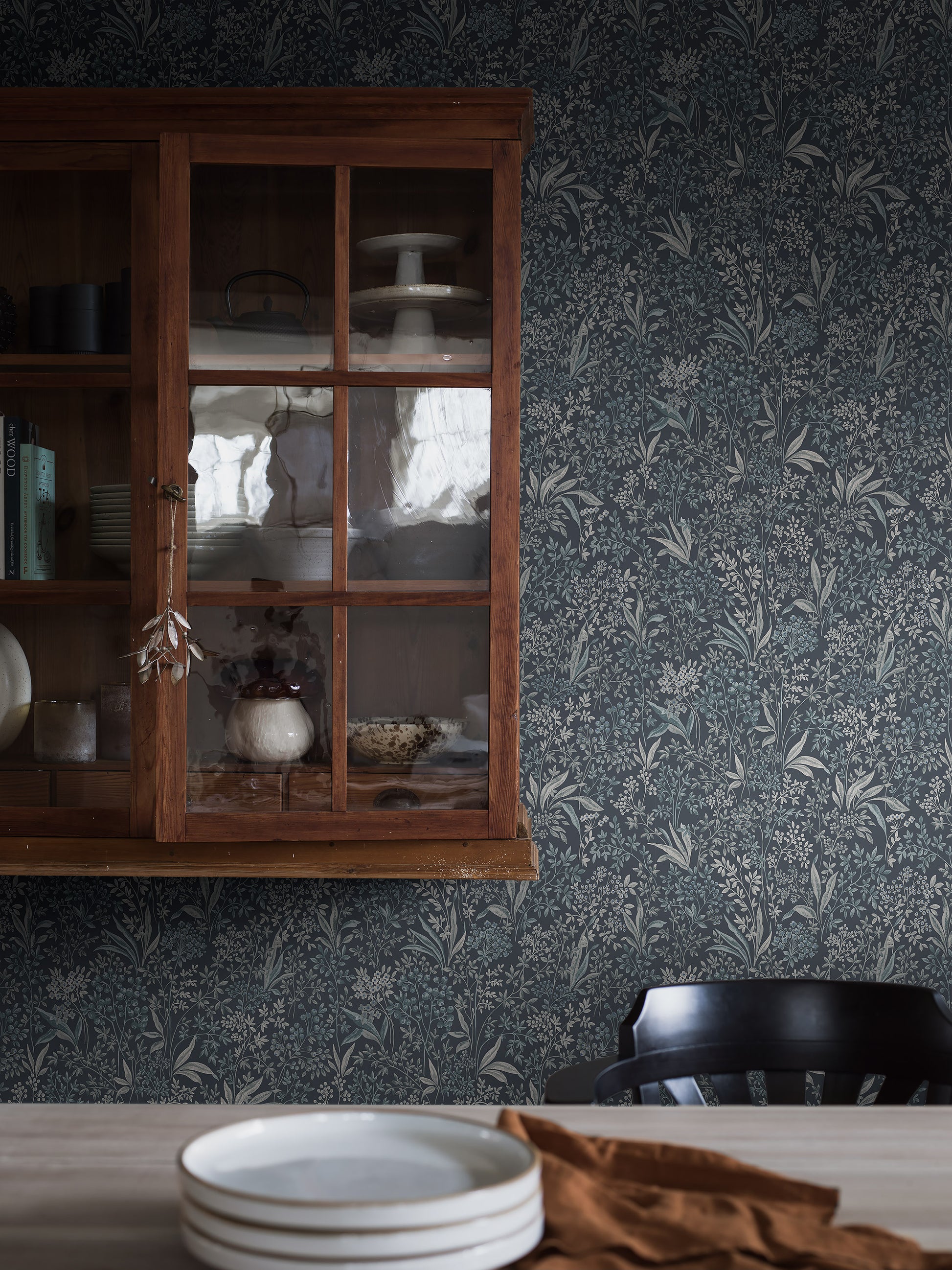 Colored in contrasting shades of blue, our Nocturne wallpaper with its Intaglio print design is full of expression and life. The flowing pattern of fabulous meandering leaves, flowers and seeds in all shapes and varieties is wonderfully lit up, using clever play between shades of blue, against a clean dark background. Scandinavian style at is best, it is an ideal choice to hang in a living room, bedroom or hallway to add warmth and depth.