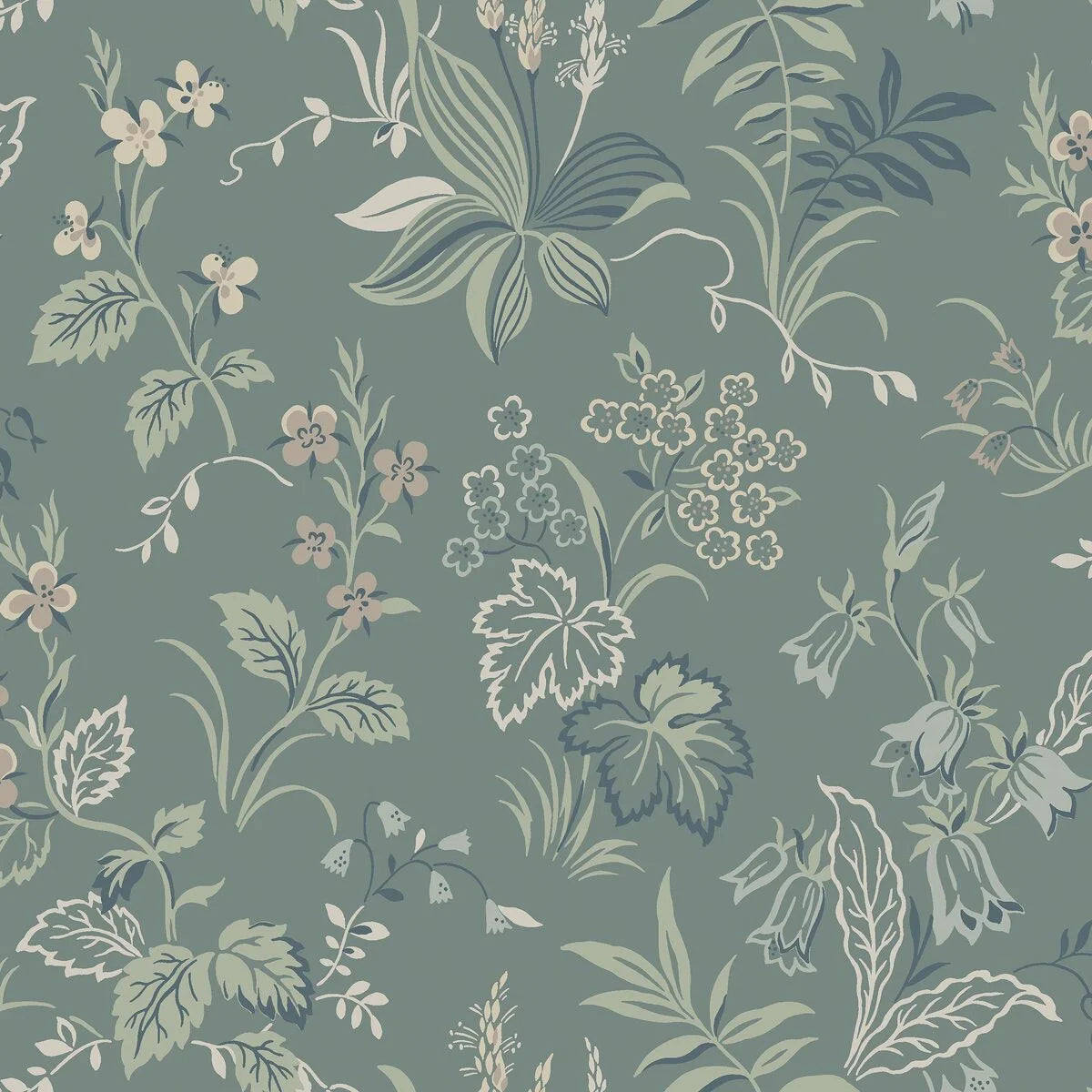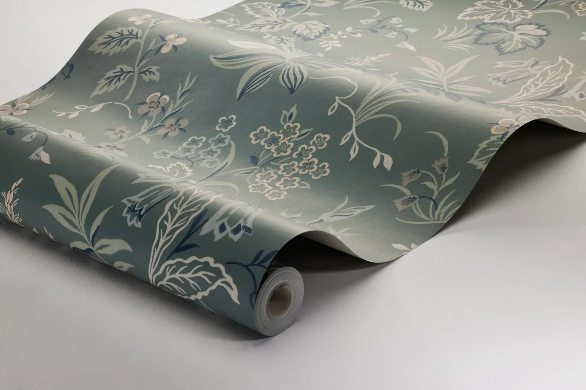 Colored in a dark twilight green with hints of olive green, indigo blue, grey, turquoise, brown and beige, our Folklore wallpaper in collagraph print features a fresh floral design from the early 1950s. Filling its surrounding space with lively and genuine expression, bell shaped flowers, dainty forget-me-nots and luscious leaves gently climb the walls.
