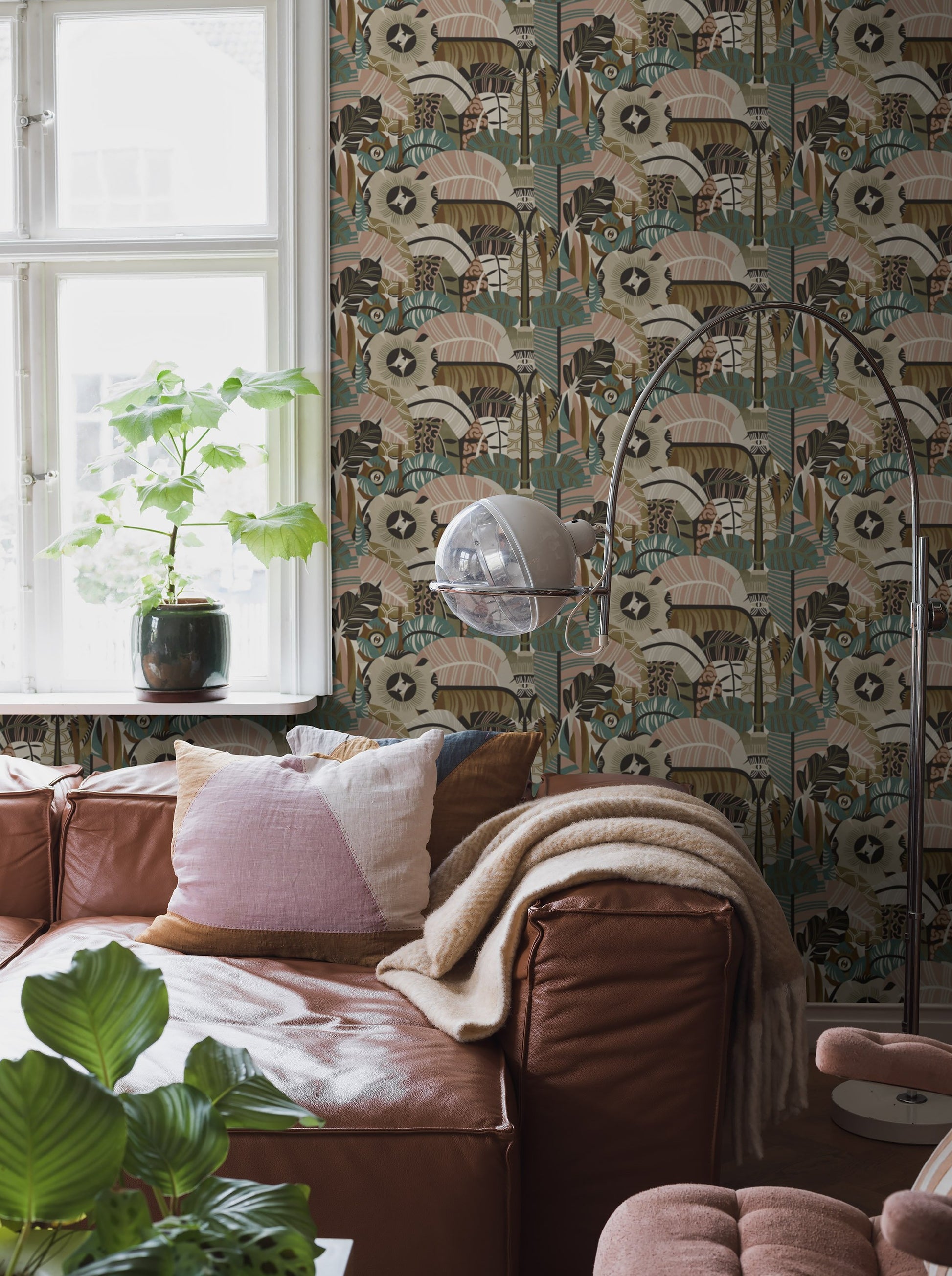 Colored in a pastel palette of brown, beige, pink and turquoise, our Hypnotic Safari wallpaper features designs from an artwork series depicting the cycle of life. Can you spot the peeking eyes in Petra Börner’s stylistic signature cut paper pattern?
