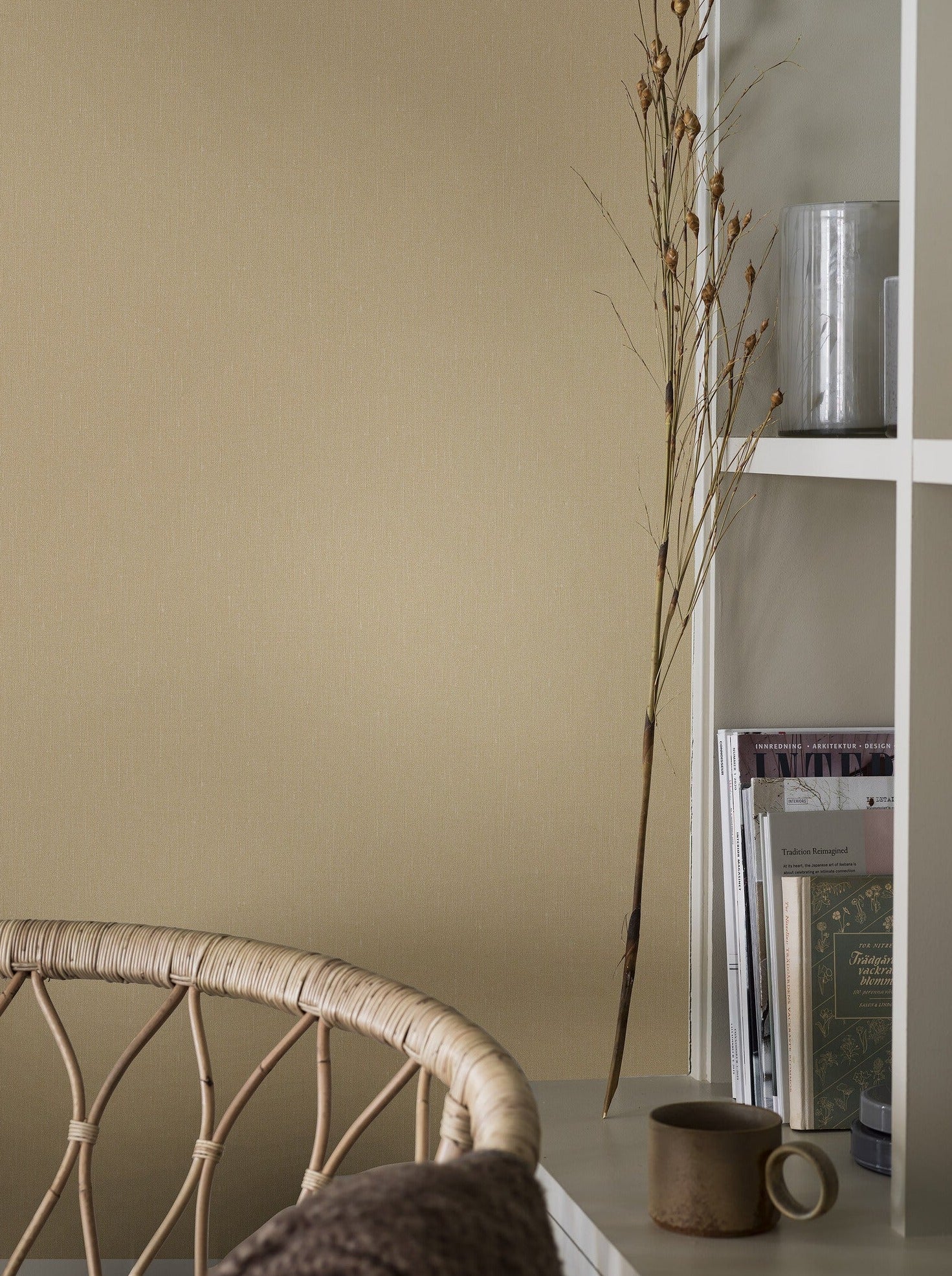 Linen Oat wallpaper has a muted and soft yellow tone which creates a light and welcoming aesthetic in rooms. The beautiful linen structure has a subtle shimmer and a warm, soothing textile feel.