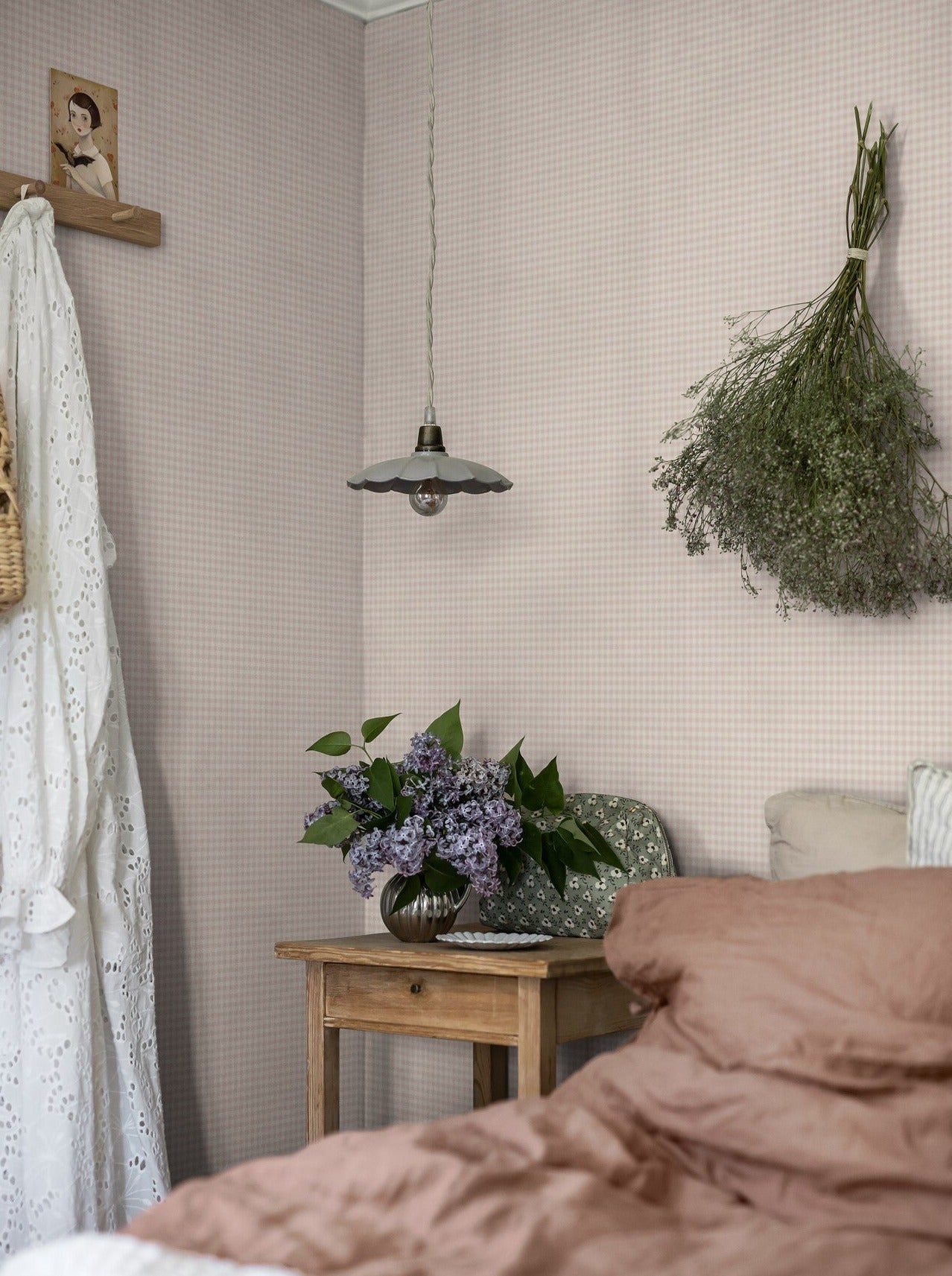 Picnic Check has a timeless check pattern with a modern twist. Its charming small squares are coloured in an elegant light pink and off-white palette. Printed on a subtle, tactile linen base, the wallpaper creates a joyful and relaxed space that gives you the welcoming feeling of home.