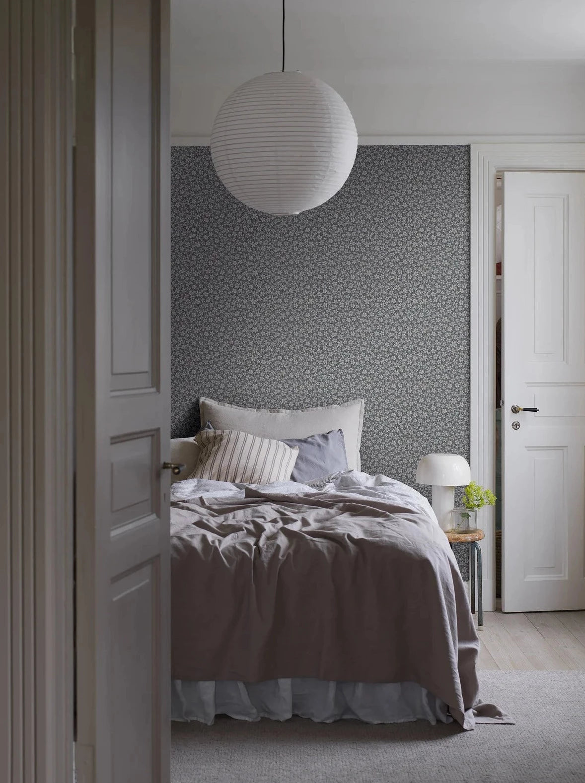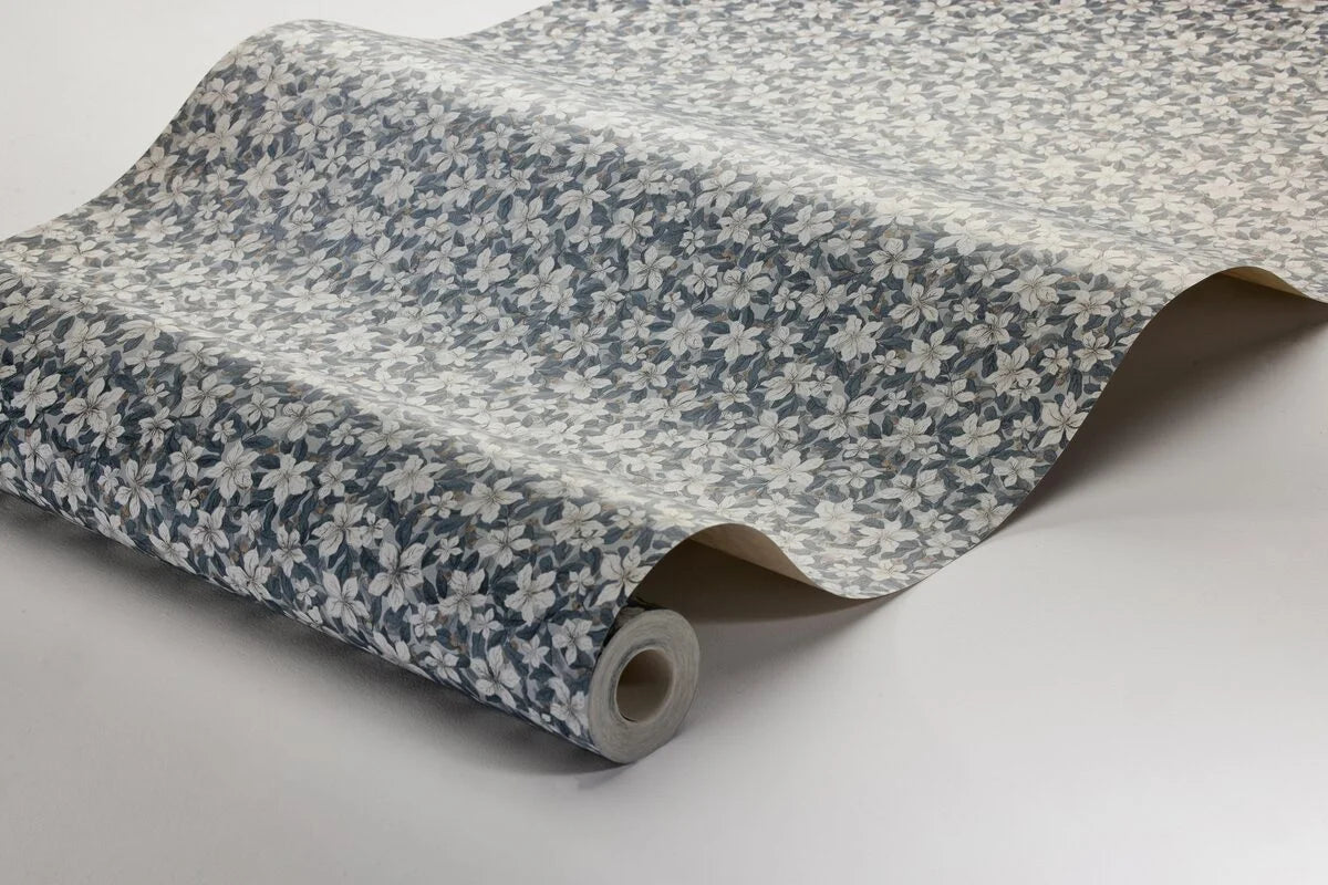 Colored in a medley of dark fog blue, beige and light silver grey, our Skogsblomst wallpaper adds a welcoming and decorated feeling to its surrounding space. Hand-painted in watercolors, the enchanting dense pattern of small dainty flowers is calming and cool, like a solid-color wallpaper.