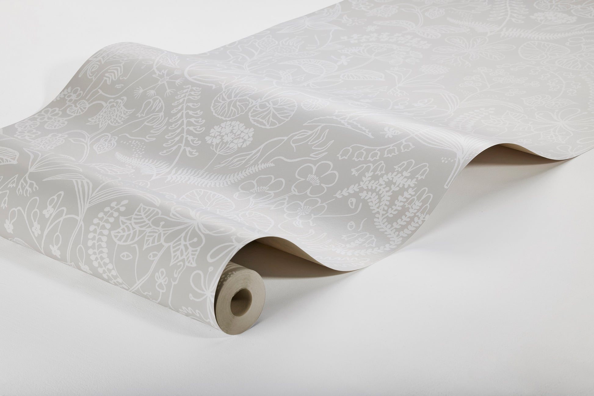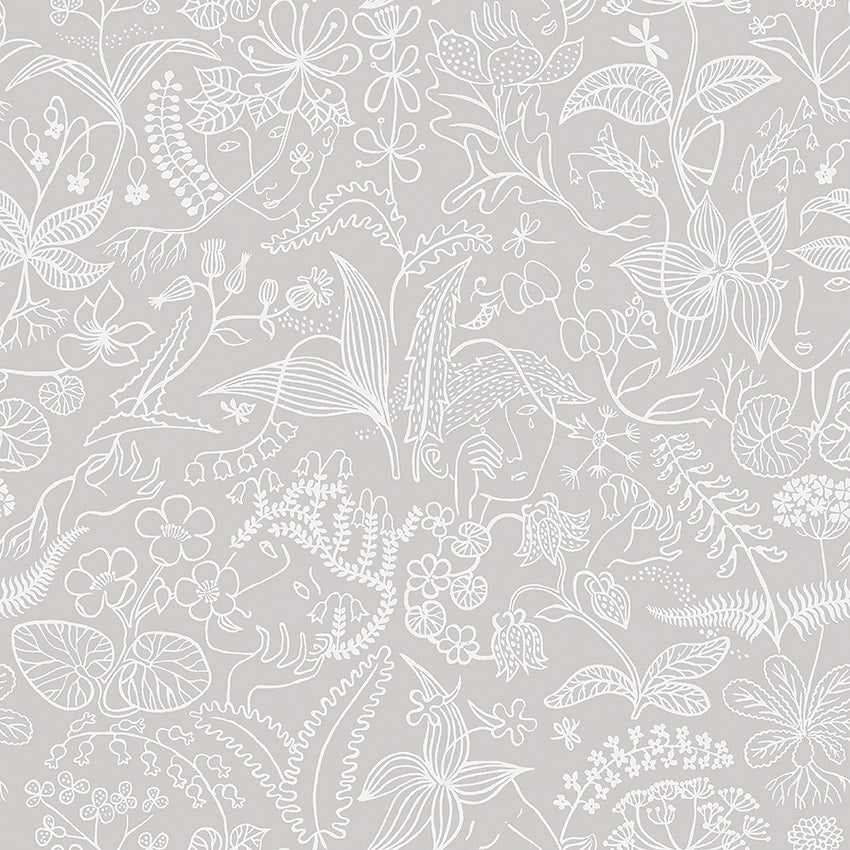 Colored in a pastel grey background with a white pattern, our Grazia wallpaper features illustrated rounded flowers and leaves with faces peeking through the foliage. This sublimely stylish and playful pattern is taken from the archives of Swedish designer Stig Lindberg, renowned for this whimsical décor. Hang it in your living room, office or bedroom for a gracefully beautiful interior.