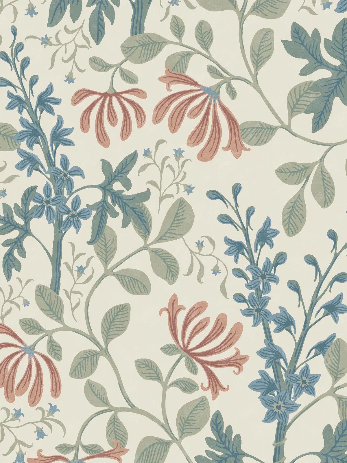Trädgårdsfröjd Grand is an enlarged reprint of Nora Tysklind’s floral wallpaper Trädgårdsfröjd. The winding pattern of honeysuckle and delphiniums is painted with inspiration from Dalarna, and here the wallpaper comes in tones influenced by traditional folk colors: muted shades of red, blue and linden green on a beige background.