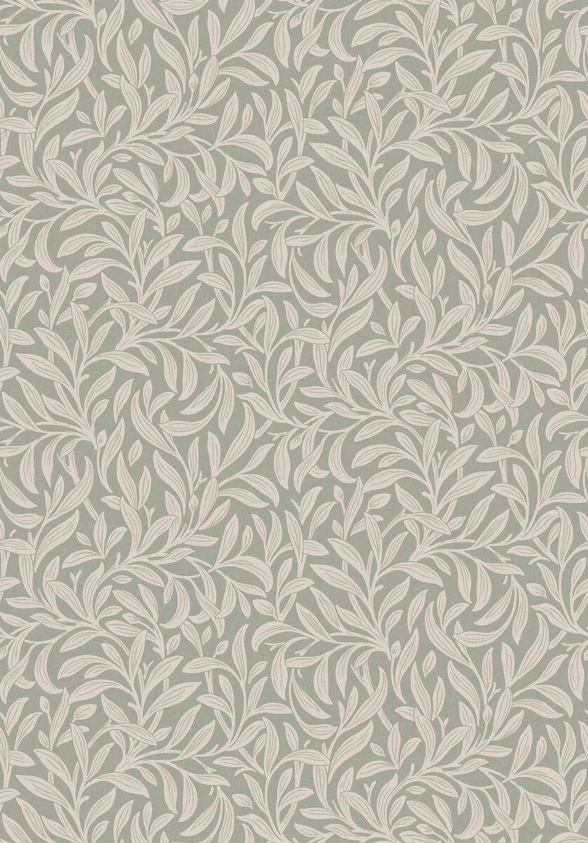 Vintergröna Grand’s winding foliage wraps the room in harmony. The Arts & Crafts-inspired motif is borrowed from the Vintergröna wallpaper, and Vintergröna Grand is an enlarged digital reprint of it. The large scale gives this lively yet calm pattern a subtly new character.