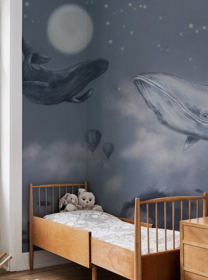 The majestic giants of the sea sail across the starry sky among schools of fish and balloons in this playful wallpaper, reminiscent of Moby Dick. This popular wallpaper comes in several color schemes, inducing a peaceful slumber. Create a dreamy atmosphere with sweet clouds against a pigeon blue backdrop.
