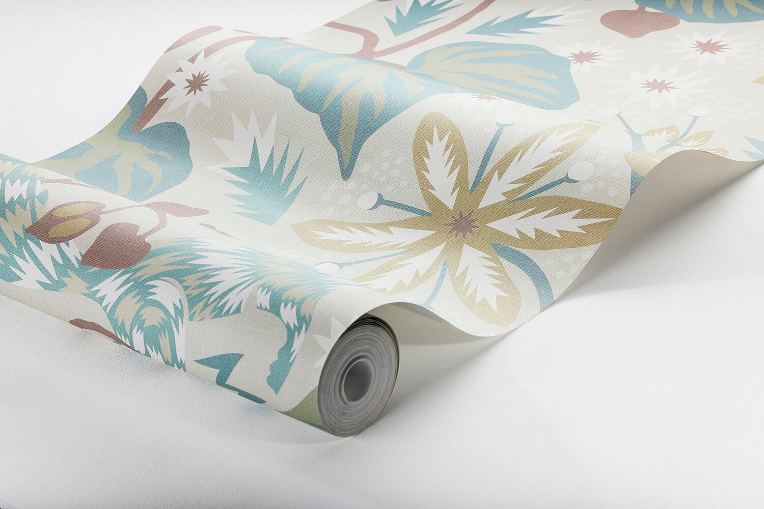 Coloured in a soft palette of muted green, brown and blue on a light beige background, our Zingkorre wallpaper is fun and playful. Featuring a pattern with constant movement where bushy tailed squirrels search for nuts and berries in a dense covering of leaves of all shapes and sizes, it is inspired by views from the kitchen window of its designer, Hanna Werning.